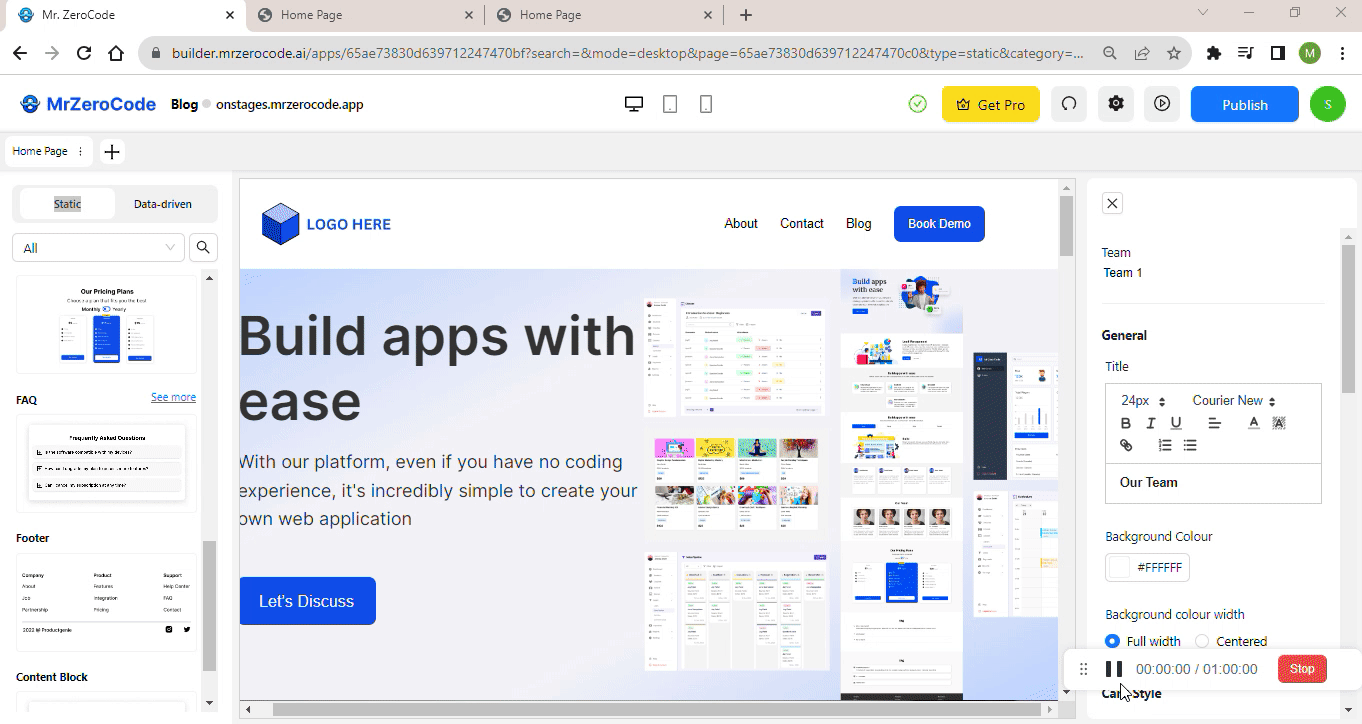 MrZeroCode's SmartBlocks feature empowers you to bring your ideas to life fast without writing a single line of code. Simply select from a wide range of beautiful templates, drag in UI elements, forms, tabs and more, connect to data sources, and your professional-grade app or landing page or website is ready.